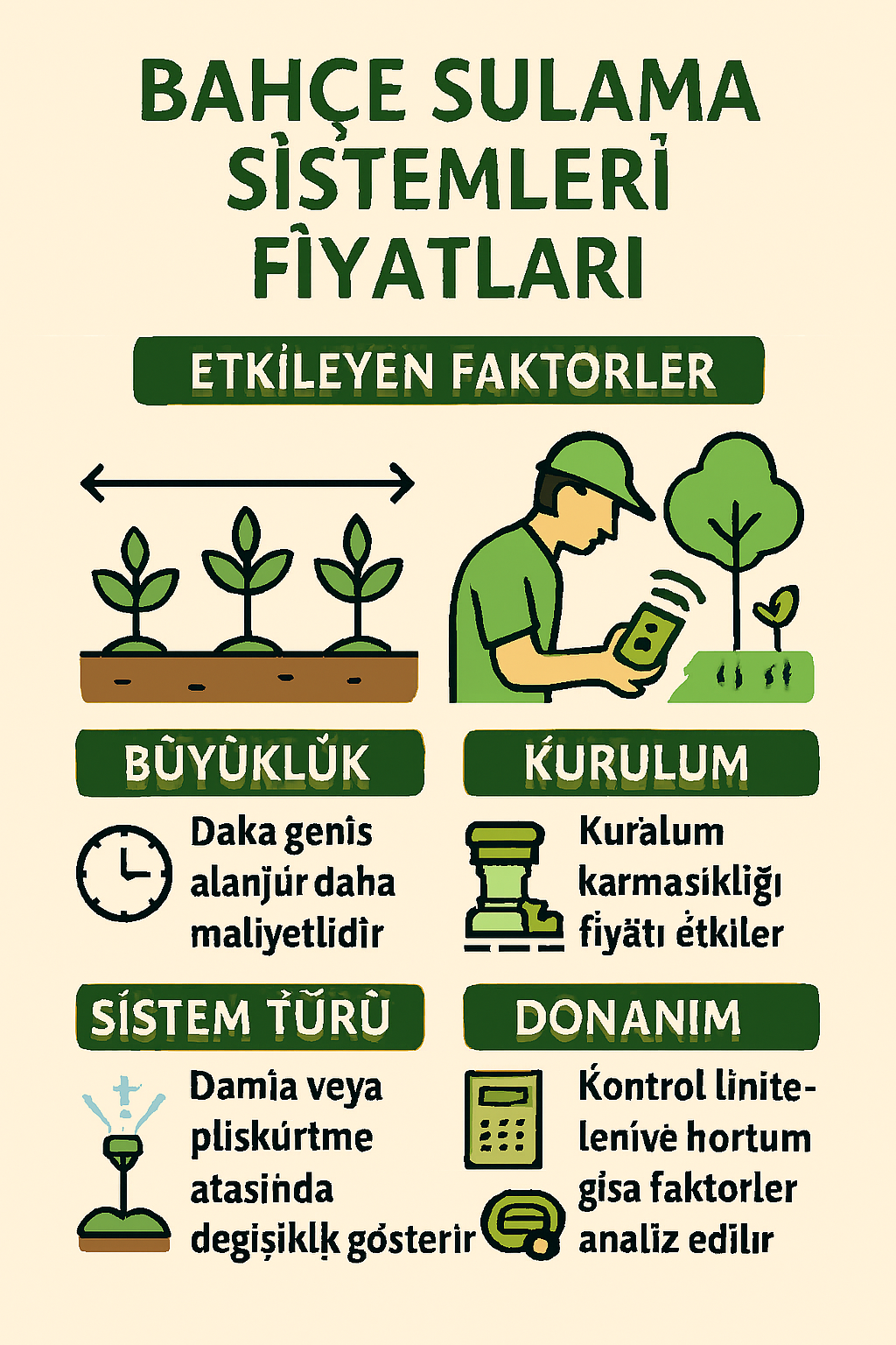 Bahçe ve bitkilerin suya ihtiyaçlarını karşılamak üzere kurulan otomatik kontrol edilebilen bahçe sulama sistemidir. Toprağın içerisine gömülü olarak dekore edilerek dışardan herhangi bir boru görüntüsü olmamaktadır. Döşeme yapılacak olan boruların gömülmesi için oluklar açılarak buraya boru yerleşimi yapılmaktadır. Otomatik vana sistemi kurulumu da yapılarak borulara izolasyon yapılması gerekmektedir. Bu da kış ayları için buzlanma durumunu önleyici niteliktedir.Bahçe Sulama Sistemleri Fiyatları otomatik sulama sisteminde zaman sensörü ile belli aralıklarla sulama işlemi yapılmaktadır. Ayrıca yağmur sensörü ile de yağmur yağdığında sulamayı erteleyerek yeniden zaman düzeni yapmaktadır.
