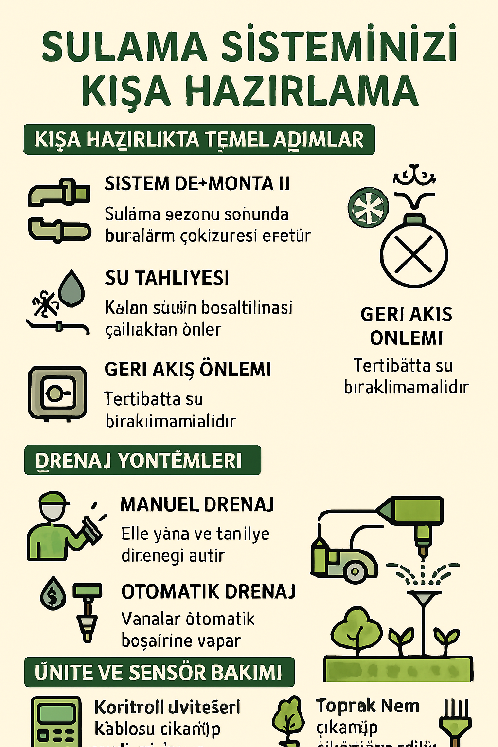 Su Sistemleri Kışa Nasıl Hazırlanır?Sulama sezonu sonrasında kurulumun de-monte edilmesi, boruların nitelikli şekilde korunmasını sağlar. Su sistemi içerisindeki tüm suların tahliye edilmiş olması, tam olarak sağlanamaz. Bu da doğrudan, don riski oluşturur.